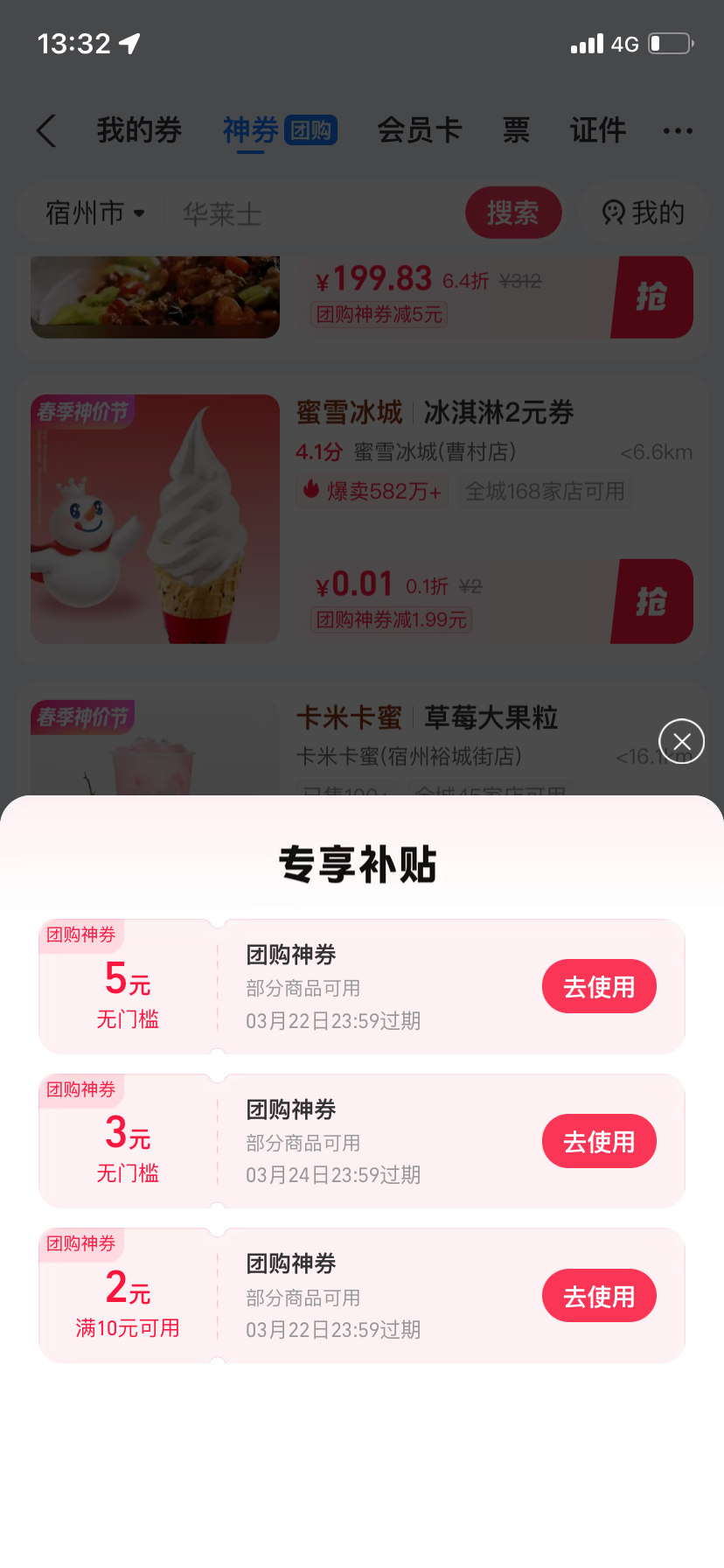 支付宝,点击卡包,会蹦出一个无门槛的5元券,0.01能吃个冰淇淋,或者小孩姨做的大杯饮料,老哥们吃一口去去火吧, ,
