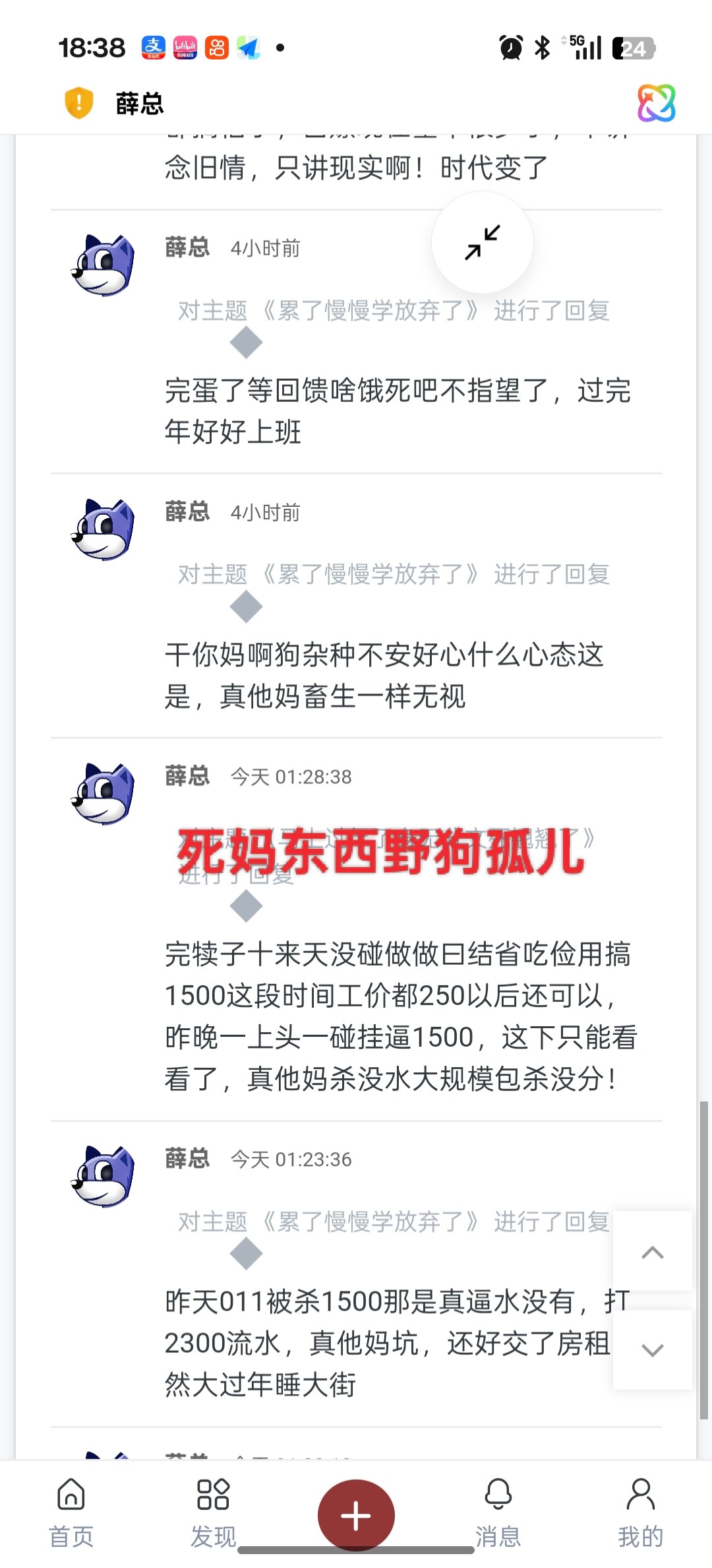 薛总: 老子看你他妈就是个脑残,天天发一些没用重复的东西还套现,怎么不把你全家套进去傻B玩意,你看看你发的都是什么鸡吧杂碎,闲的蛋疼没一点营养