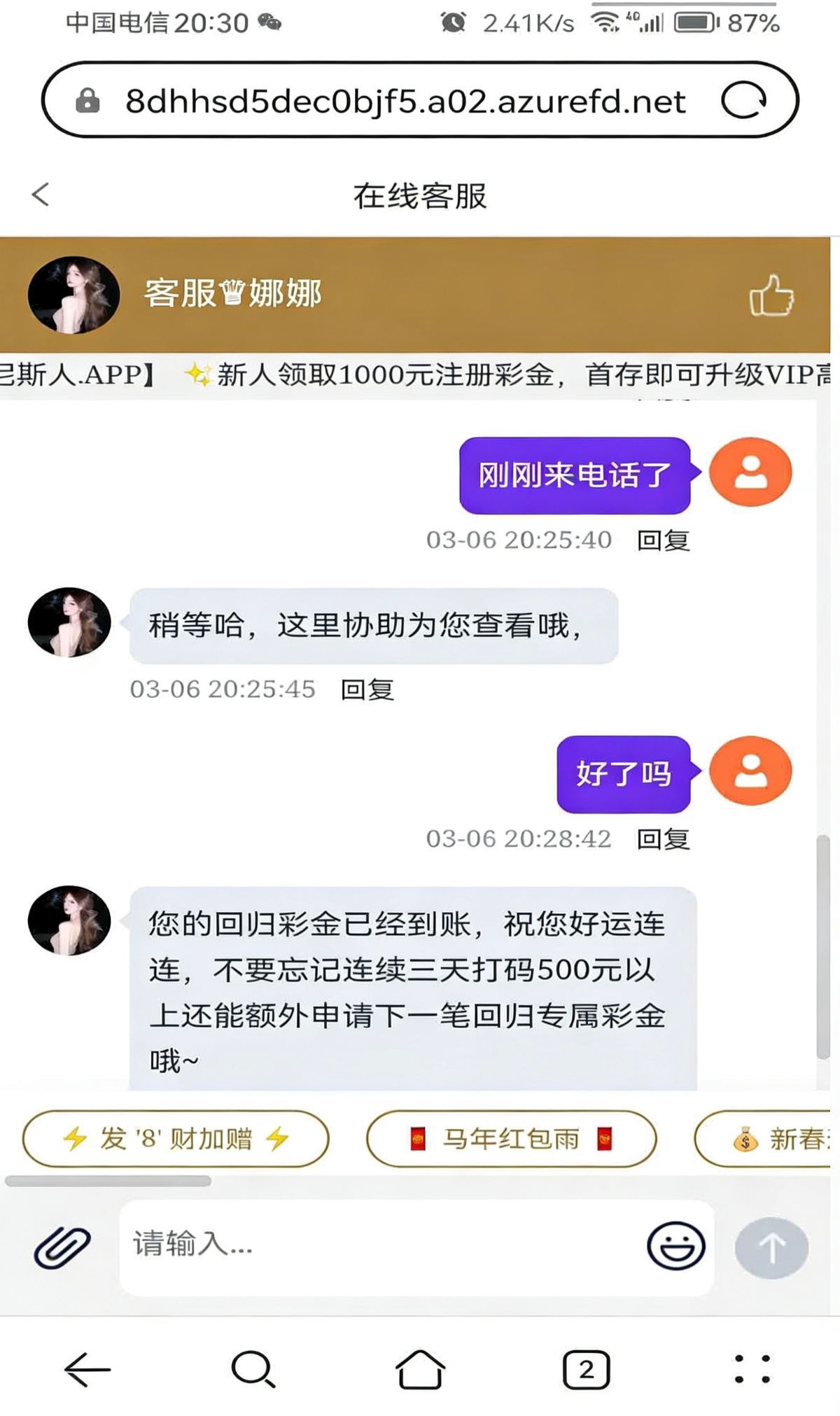 忘记了什么时候注册的了现在才来电话 送了28要下载三条聊天软件 可以去碰
