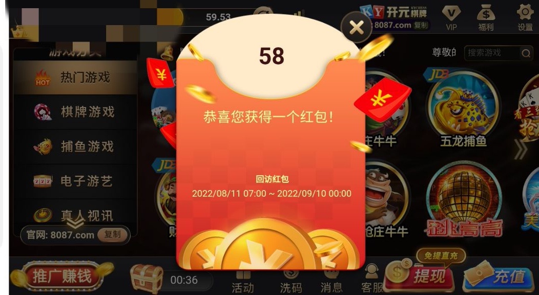 活动:老用户登入自动弹出红包回馈58-1888