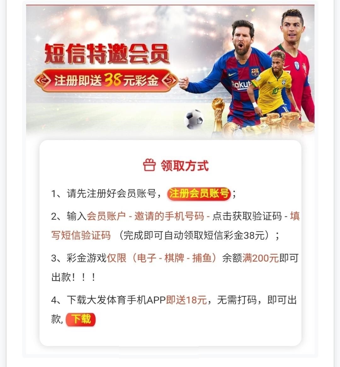 新用户注册完善资料活动里自助申请38,下载还能申请18,无游戏限制,最低380提现,这个台子的特邀申请链接就是大发体育,账号不通用。