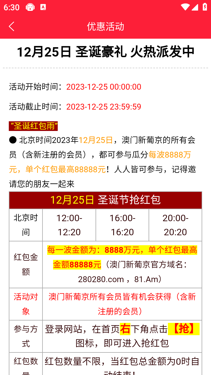 注册绑卡下载APP,活动优惠里面自行申请彩金,2023年12月25日圣诞节红包基本都是大包,完全不需要充值,每天还有免费红包抢,新人注册都有下载APP注册彩金送!