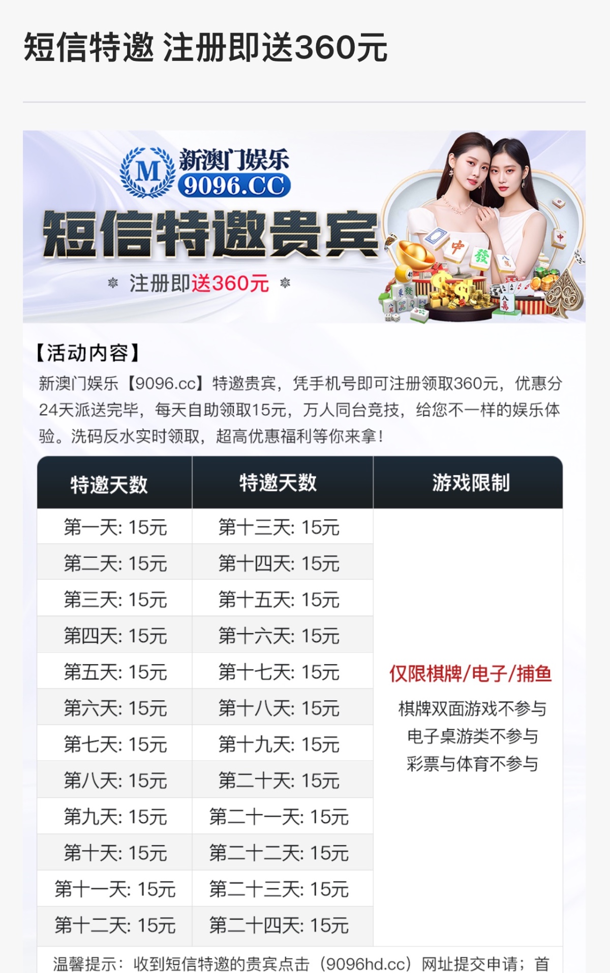 新用户注册绑卡 去申请网站自助申请特邀彩金 第一天15 第二天需要充值禁止充值,游戏和提款限制自行查看优惠