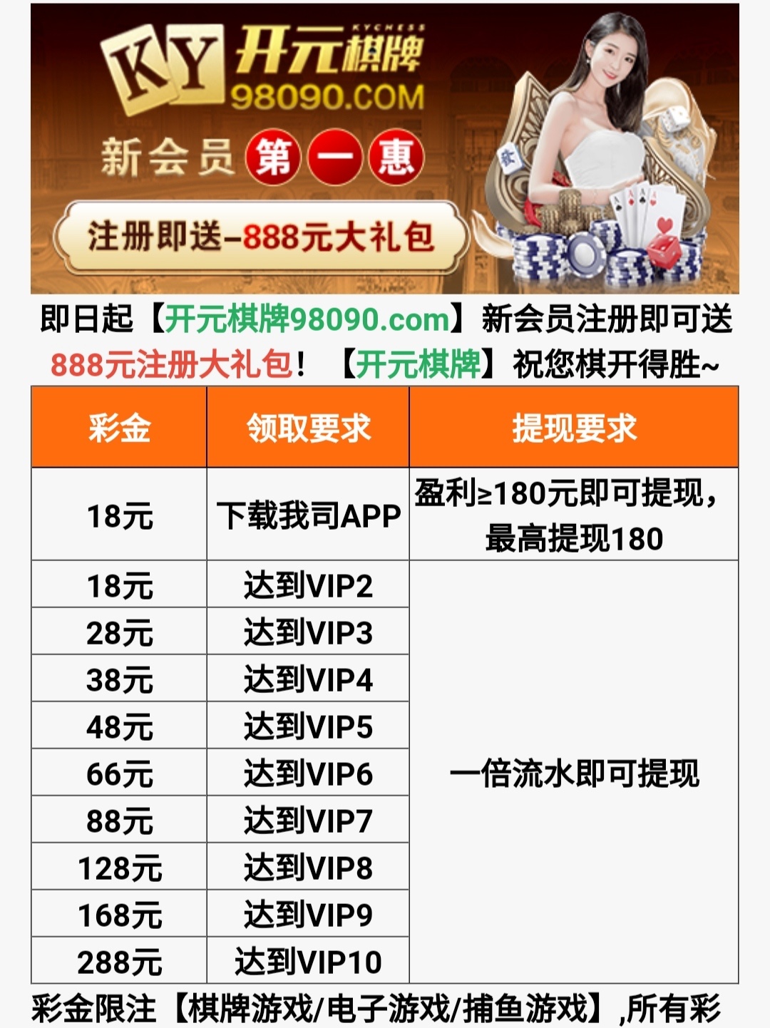 限制棋牌/电子/捕鱼,最低.最高180提现。