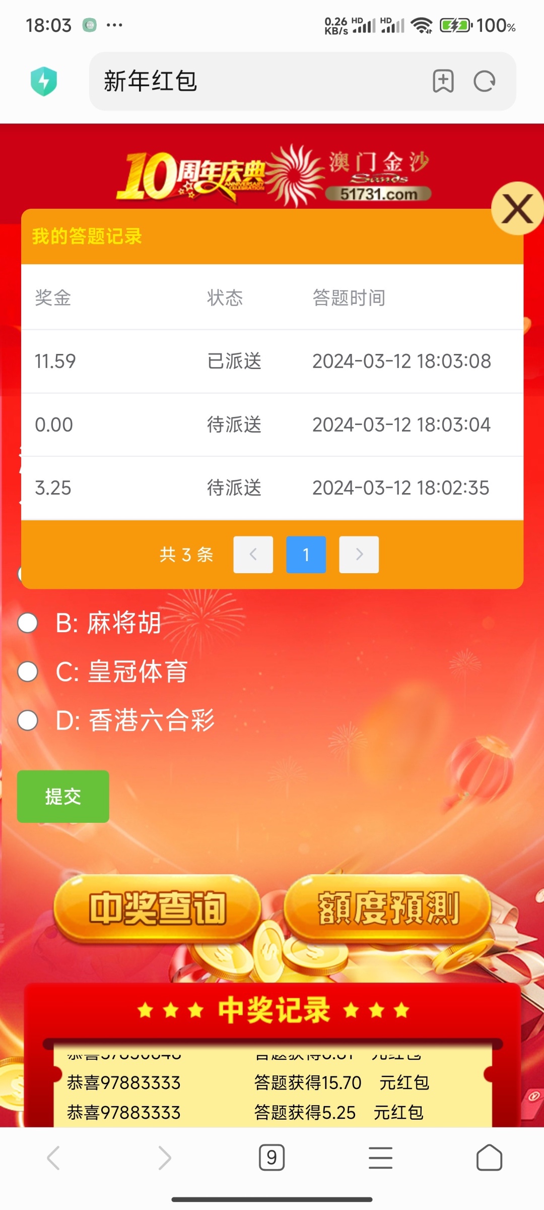 注册好了找在线客服申请三次答题机会,然后客服会给你链接去答题,答题先填自己 id 没有机会就跟客服说,客服会给你机会的,答题都是活动里面的,不知道就去看活动,那个热门游戏的答题是麻将胡了