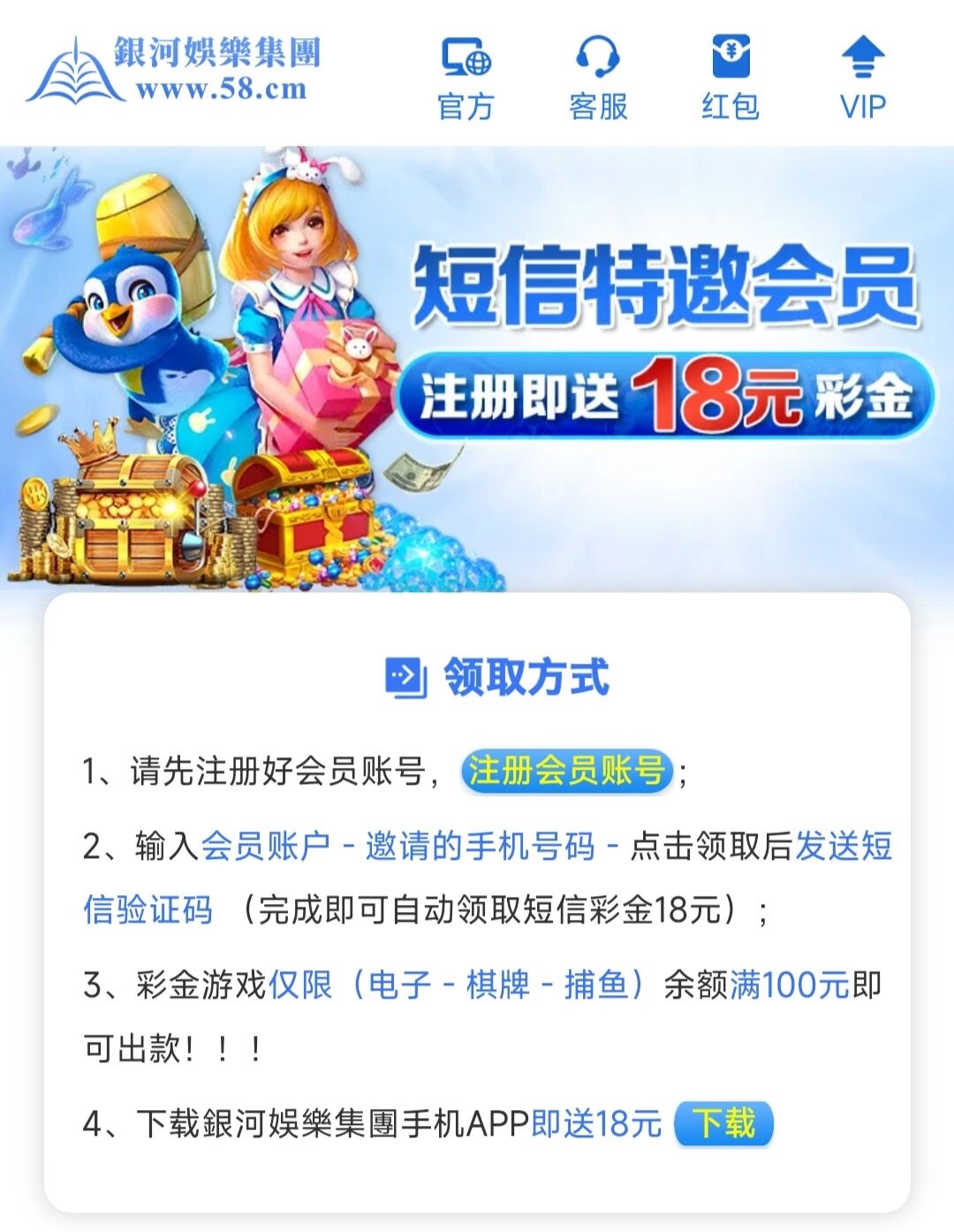 特邀碰瓷,新用户注册好去链接里申请18,限制电子/棋牌/捕鱼,最低100提现。新出的估计没多少人有,等一段时间就行了,有空就去看。