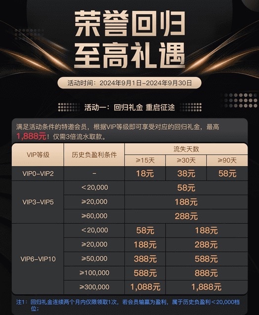 老用户15天没有玩送18 30天没有玩送38 90天送58找客服申请回归彩金