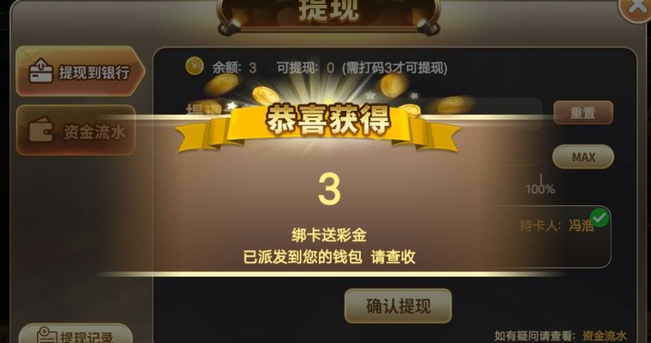 新用户注册绑卡秒送3,100提,部分特邀送38或者18,我送了38,基本很多都送群友很多反馈送了18+!只能玩棋牌游戏