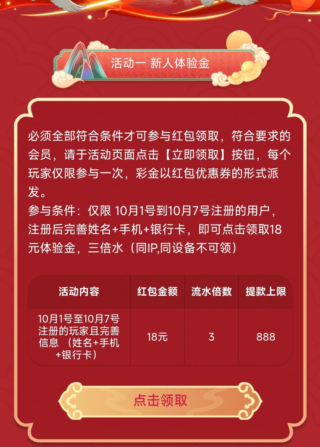 新用户注册完善资料活动里找到"国庆盛典"秒送18