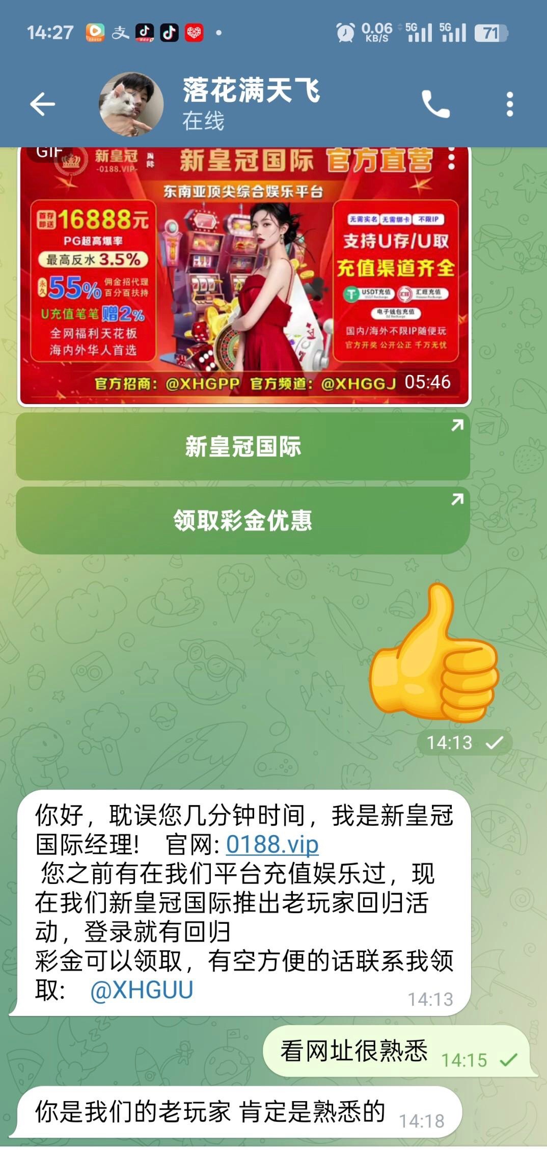 新皇冠0188.vip 在平台注册历史有过充值的老哥可联系飞机客服领取回归彩金,彩金随机,给我派送了28元彩金,飞机客服账号@XHGUU