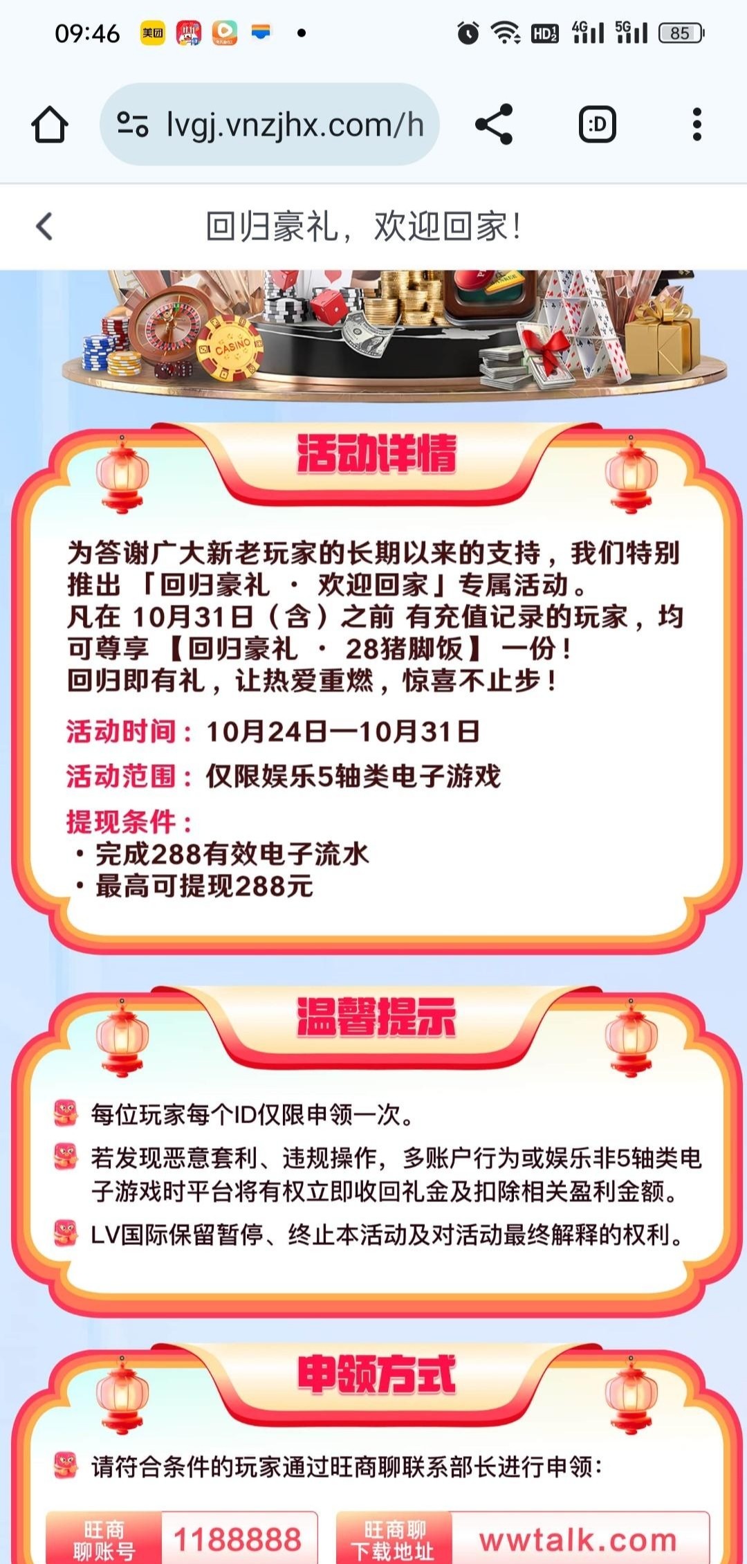 之前有充值过的,可以申请28回归彩金,2点登记的,5点才送的,没打出来链接lv9001.com