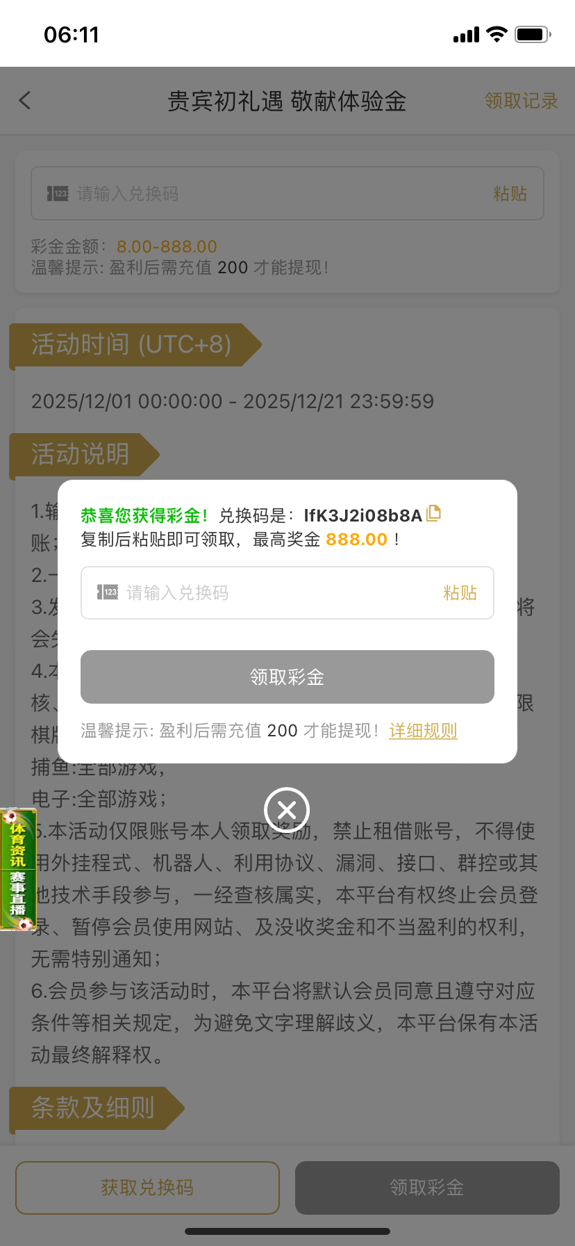 新用户注册绑定收款,点优惠活动,点暖冬,左下角获取兑换码, 就出来了, 一看就黑,不要充值, 自己测试吧 232.com