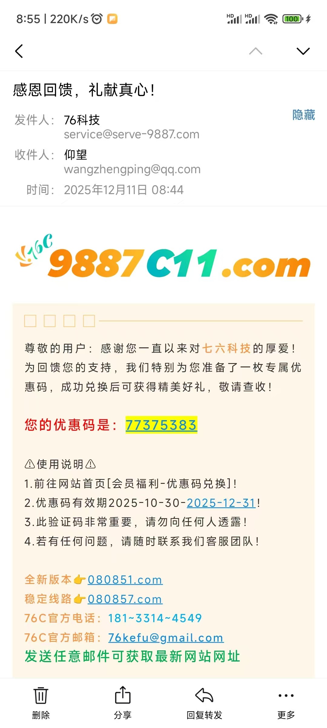 昨天看到的9887平台说邮箱彩金,注册只送8块,本以为没了,今天早上8点竟然来邮件送18彩金兑换码了,可以去撸一波,全程未充值,导航地址是080857.com,或者自己看图片上的地址就行,免得说我拉人头