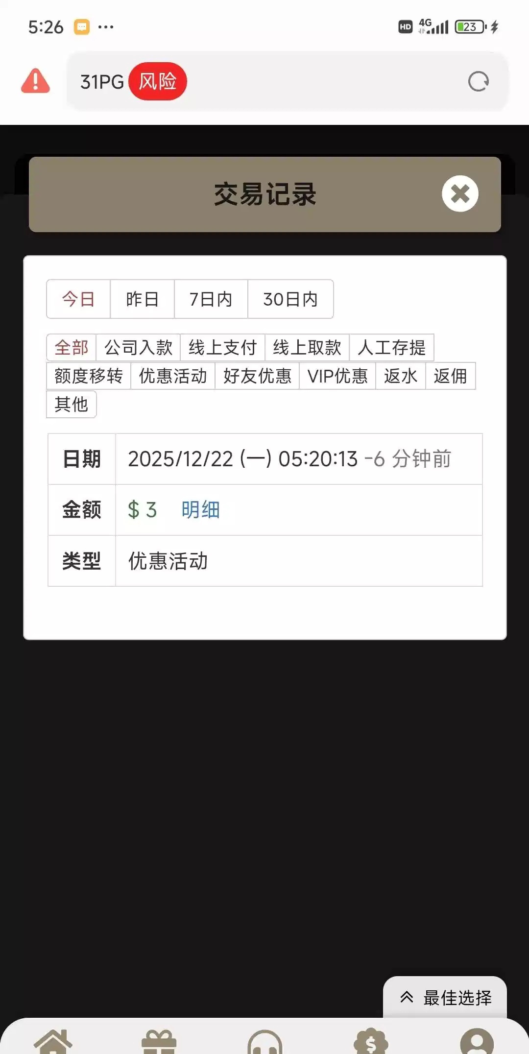 下午接的境外电话,人工报的网址6016.co十天前注册的账号,没充值过,3块没打出