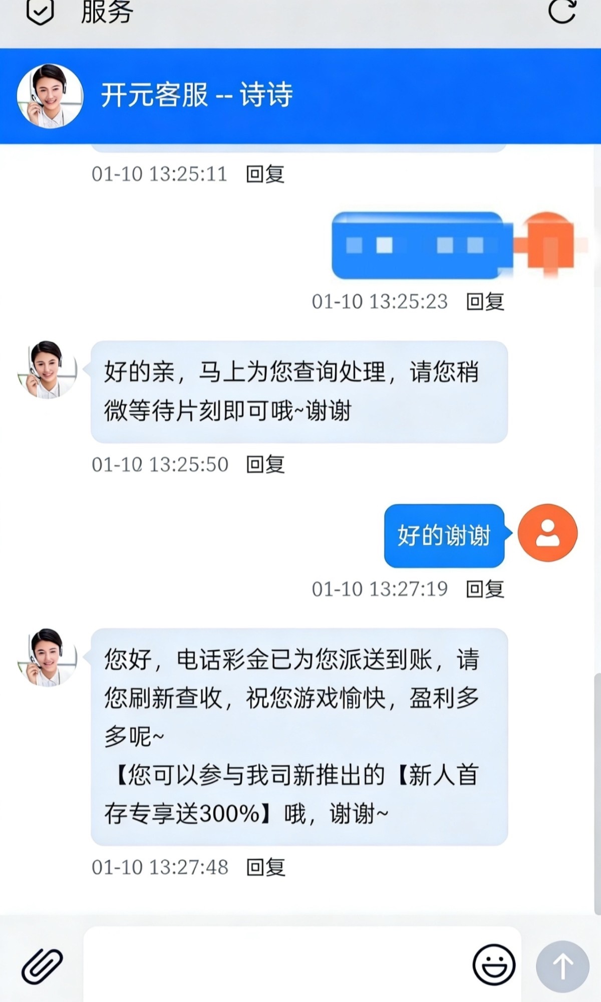 接到客服电话,上去联系在线客服送了38