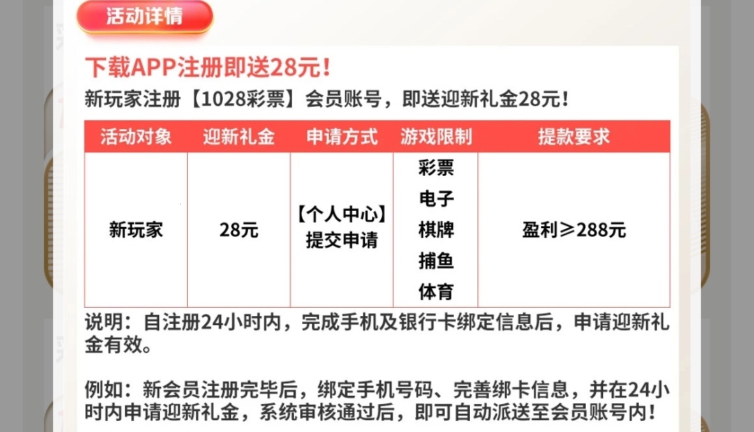 活动:新用户下载APP注册绑卡活动自助申请新人彩金送28/288提